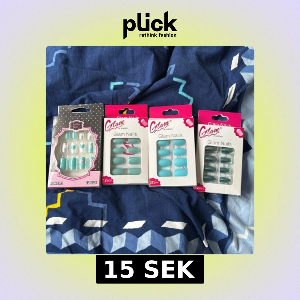 Säljer flera förpackningar med lösnaglar i olika blå, turkosa och gröna nyanser. Vissa har glitterdetaljer, andra är enfärgade. Perfekt för att snabbt fixa snygga naglar hemma. Innehåller 12 naglar per förpackning.❣️❣️ Alla för 15kr!!!❣️❣️❣️