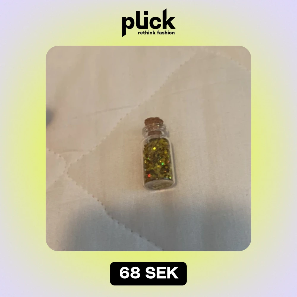 En liten glasflaska med kork innehållande glittrande ögonskugga i guld. Perfekt för att lägga till en gnistrande effekt på ögonlocken.