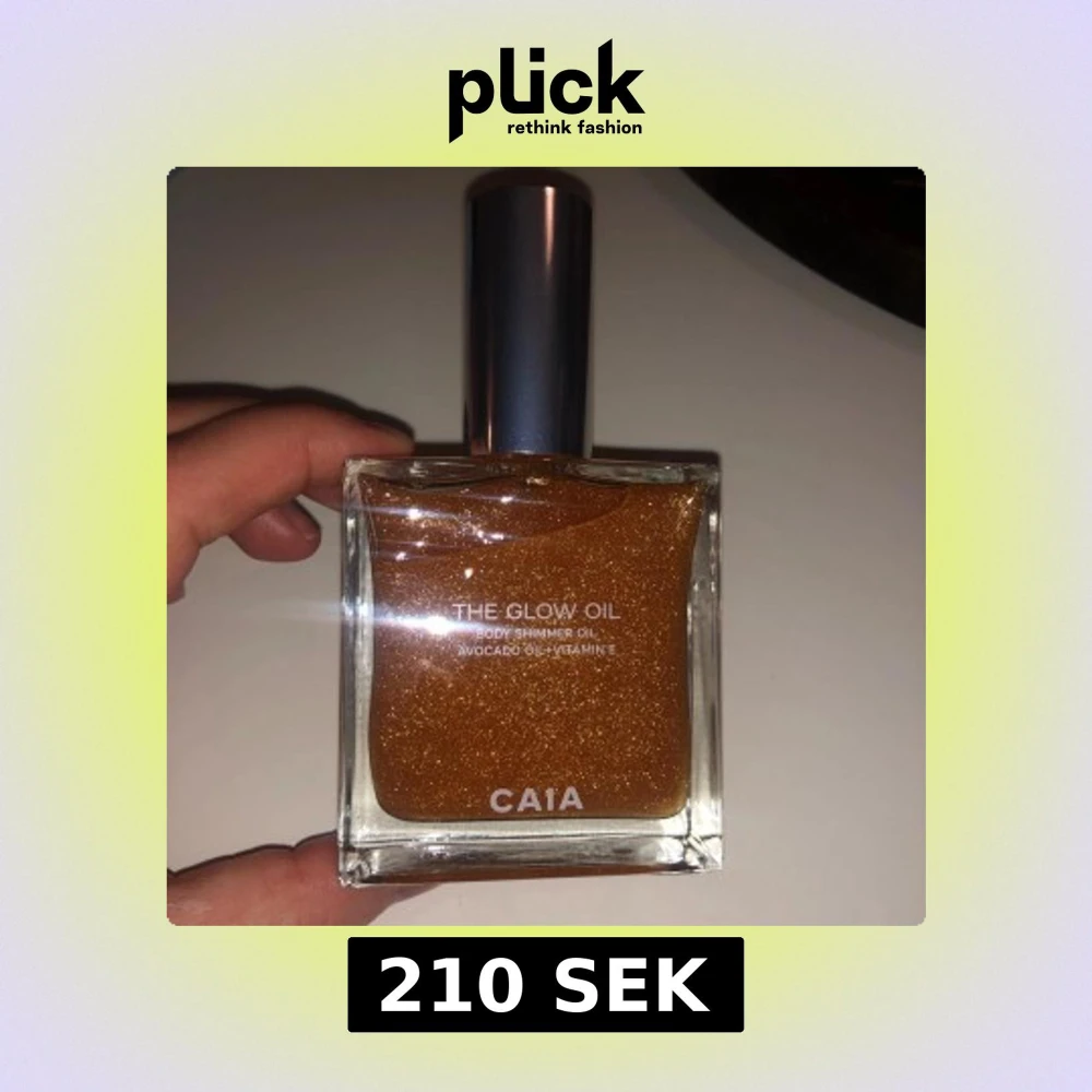 CAIA The Glow Oil är en lyxig body shimmer-olja med gyllene glitter och skimmer. Innehåller avokadoolja och vitamin E för extra glow. Kommer i en snygg, fyrkantig glasflaska med silverfärgat lock och tillhörande metallic-förpackning.