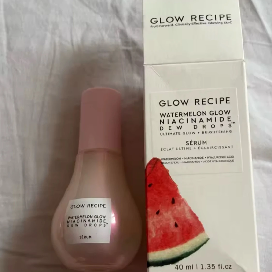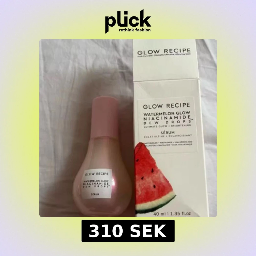 Glow Recipe Watermelon Glow Niacinamide Dew Drops är ett serum i en söt, pärlemorrosa flaska med pump. Innehåller niacinamid och hyaluronsyra för extra glow och återfuktning. Kommer i originalförpackning med vattenmelonmotiv. 40 ml. Innehåller inte parfym men luktar lite vattenmelon. Ger ett fint glow