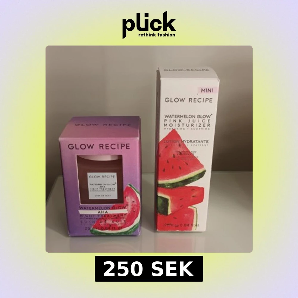 Glow Recipe Watermelon Glow AHA Night Treatment och Watermelon Glow Pink Juice Moisturizer i mini-format, båda på 25 ml. Night Treatment kommer i en rosa glasburk med ljusrosa lock och Moisturizer i en ljusrosa glasflaska med rosa lock. Säljer båda tillsammans. Night treatment är helt nu och oöppnad och krämen är lite använd som man kan se på näst sista bilden.