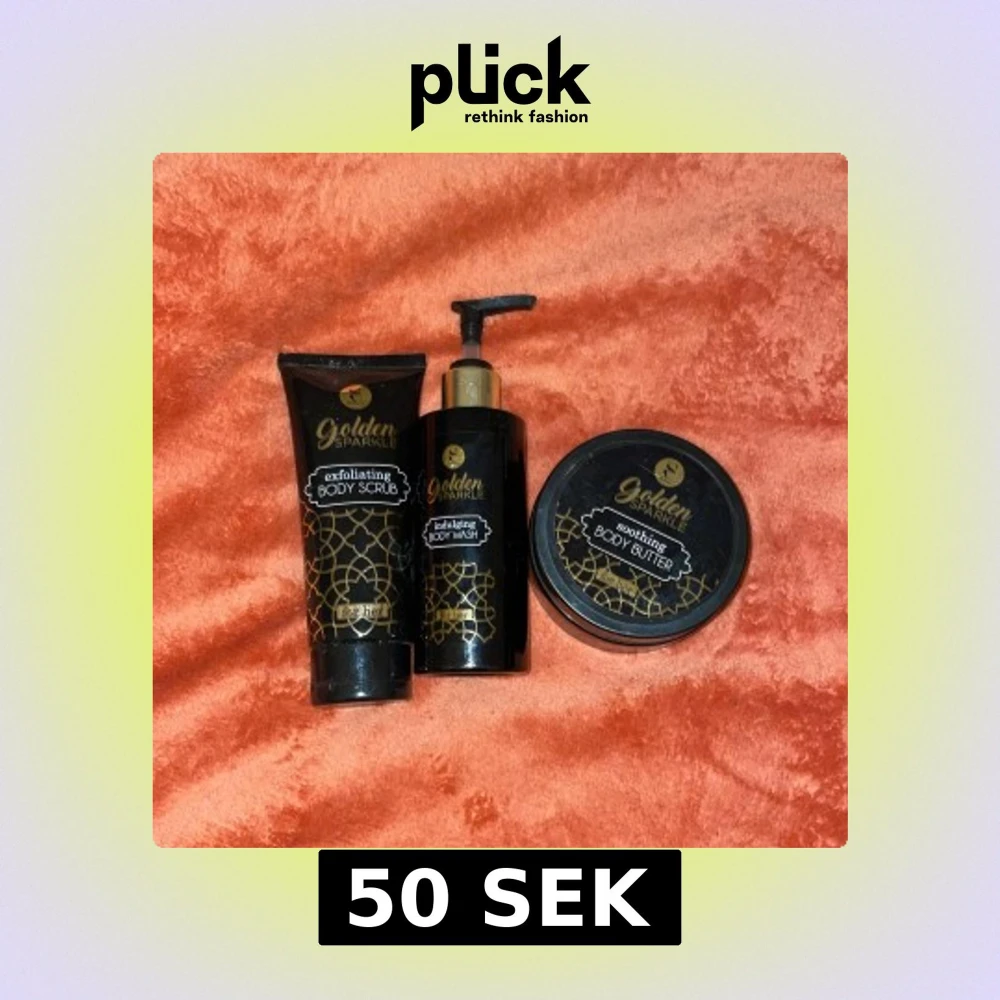 Lyxigt set med exfolierande body scrub, body wash med pump och återfuktande body butter. Alla produkter kommer i snygga svarta och guldiga förpackningar med elegant mönster. Perfekt för dig som vill ha en glittrig och fräsch känsla i din hudvårdsrutin. Helt oöppnade💓