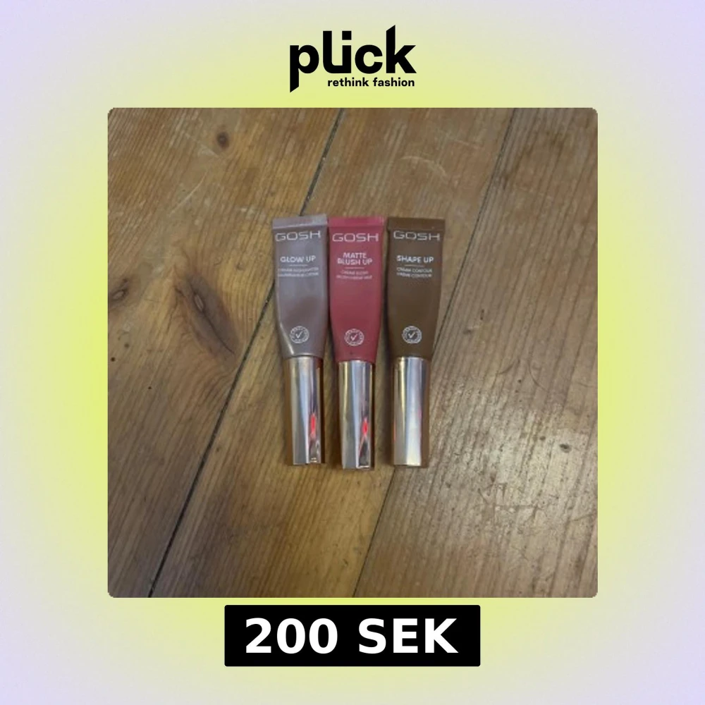 Säljer tre krämprodukter från GOSH: Glow Up highlighter i champagne, Matte Blush Up i bärig rosa och Shape Up contour i mediumbrun. Alla i smidiga tuber med applikator och silvriga lock. Perfekt för att skapa en fräsch och definierad look.