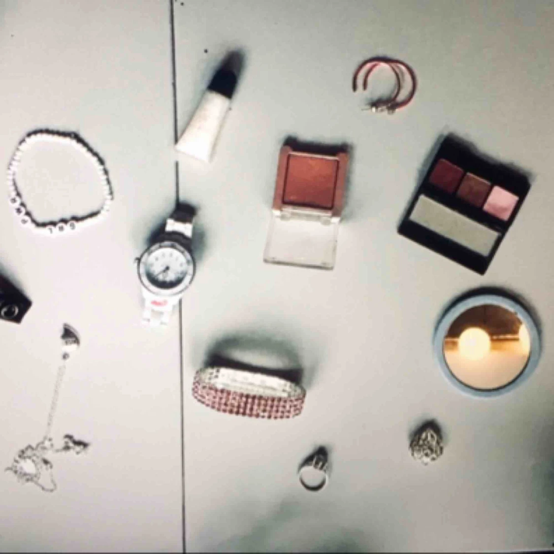 Nit-armband: 10 kr Foundation från loreal nr10 (BB medium): 15 kr GRL PWR (girl power) armband: 10 kr Klocka utan batteri (oanvänd): 50 kr Oanvänt glitter läppglans i vitt: 10 Oanvänd rosa ögonskugga: 20 kr Oanvänd ögonskugga (trepack): 25 kr