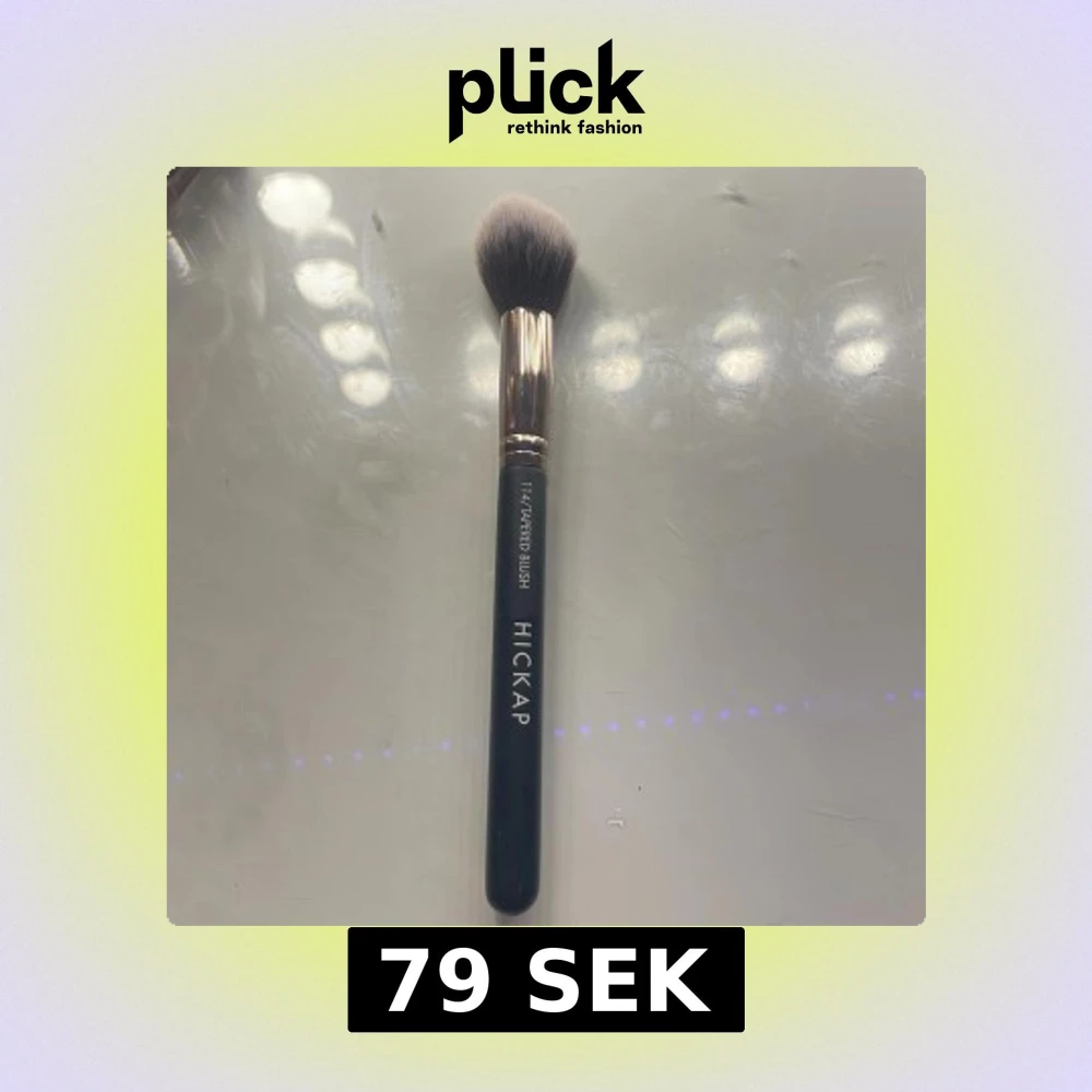 Snygg sminkborste från Hickap, modell 114 Tapered Blush. Borsten har ett svart handtag med vit logga och ett elegant roséguldfärgat fäste. Mjuka syntetiska borststrån, perfekt för applicering av rouge eller bronzer. Helt oanvänd