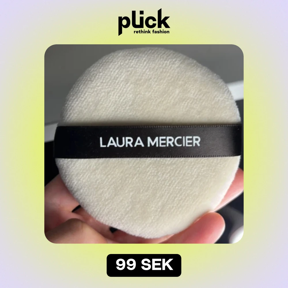 En rund, vit puderpuff från Laura Mercier. Oanvänt pga fel storlek. Puffen har en mjuk yta och ett svart band med märkesnamnet tryckt i vitt.