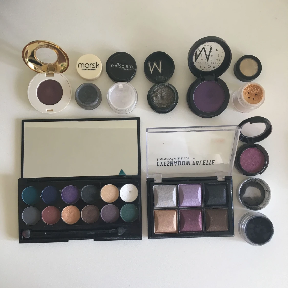 - plommonlila, H&M - mineraskugga, stålgrå - pärlemorskimrande, bellapierre - lös ögonskugga, make up store - plommonlila, make up store - guldskimrande ögonskugga - matta ögonskuggor, Sleek - sex skimrande - lila ögonskugga - svart mineralskugga, TiKei