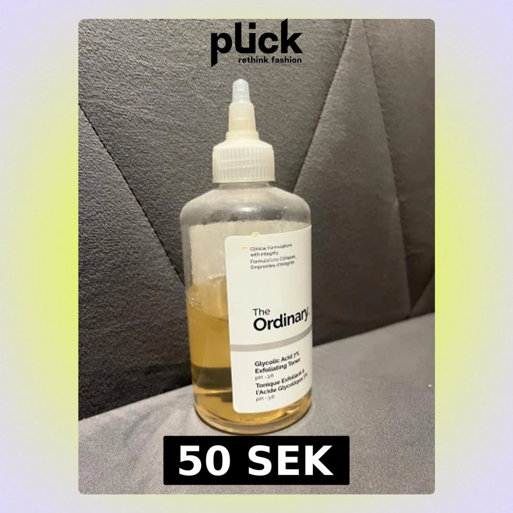 Exfolierande toner från The Ordinary med 7% glykolsyra. Kommer i en genomskinlig plastflaska med vit etikett och skruvkork med pipett. Vätskan är ljusgul och flaskan rymmer 240 ml. Perfekt för dig som vill ha glow och jämn hudton. Halva kvar