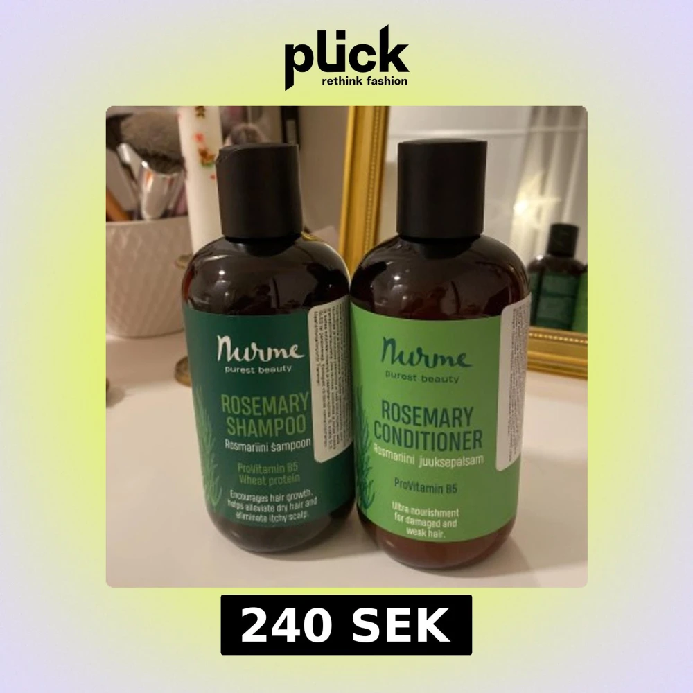 Set med rosmarinschampo och balsam från Nurme. Schampot innehåller Provitamin B5 och vetegroddar för att stärka håret och motverka mjäll. Balsamet är rikt på rosmarinolja och ger näring och fukt till torrt och skadat hår. Perfekt för att främja hårväxt och lugna irriterad hårbotten. Säljer då jag råka köpa flera par, aldrig använda