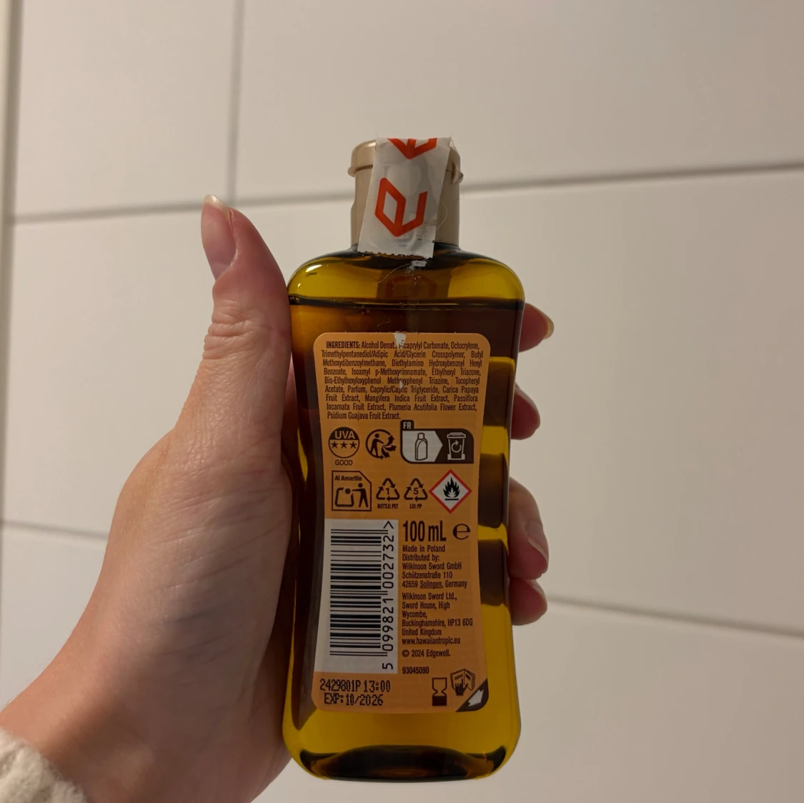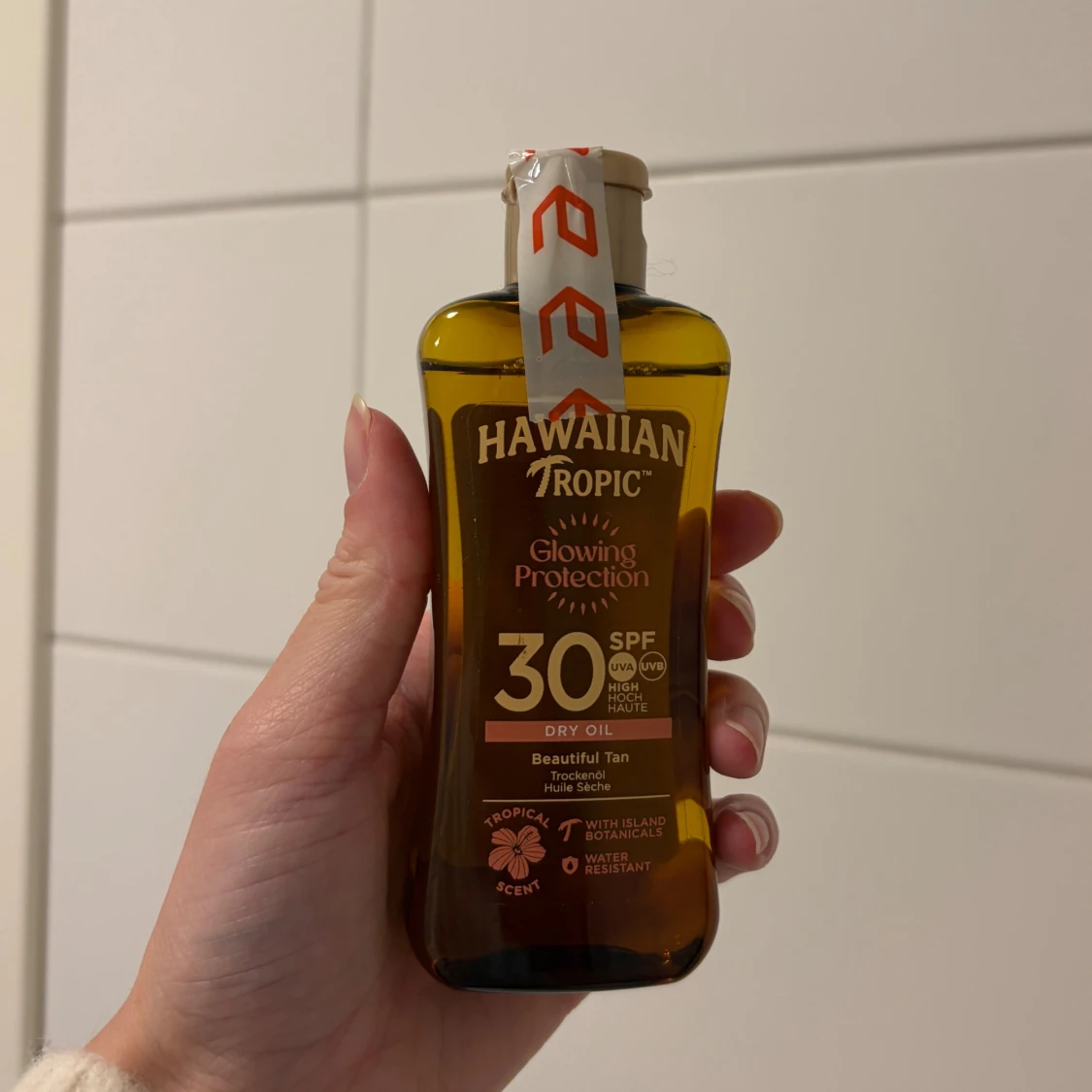 Säljer en brun plastflaska med Hawaiian Tropic Glowing Protection Dry Oil SPF 30. Oljan ger en vacker solbrun ton och har tropisk doft. Innehåller botaniska extrakt och är vattenresistent. Flaskan rymmer 100 ml och har en praktisk skruvkork. Köptes inför resa men användes aldrig