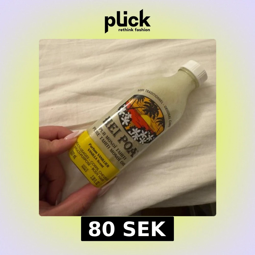 Monoi-olja från Hei Poa med vaniljdoft, 100 ml. Oljan kommer i en genomskinlig glasflaska med vit kork och tropiskt motiv på etiketten. Perfekt för både kropp och hår, innehåller kokosolja och tiareblomma. Helt oanvänd!💛