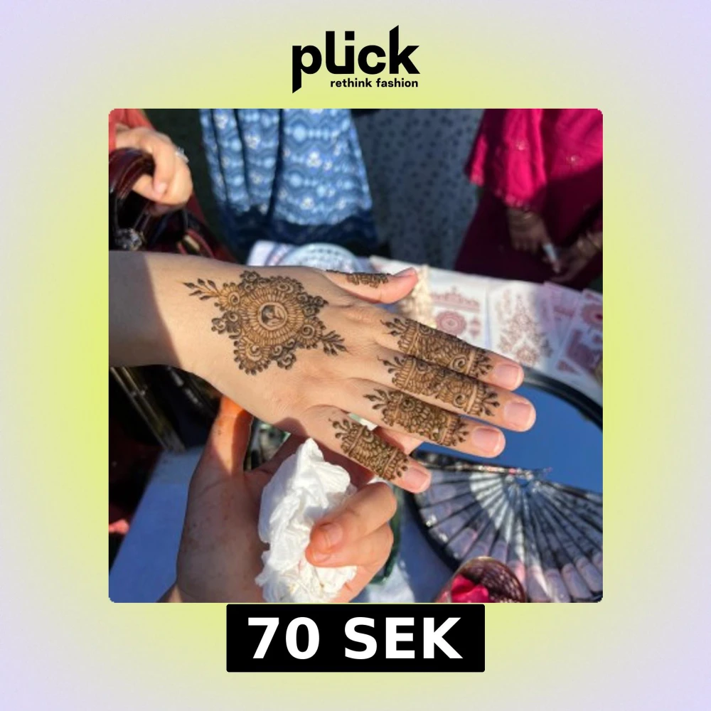 Unik henna-tatuering på handen med detaljerat blommigt och cirkulärt mönster. Designen täcker handryggen och fingrarna med fina linjer och bladmotiv i mörkbrun färg. Perfekt för dig som vill ha en kreativ och traditionell look till speciella tillfällen.
