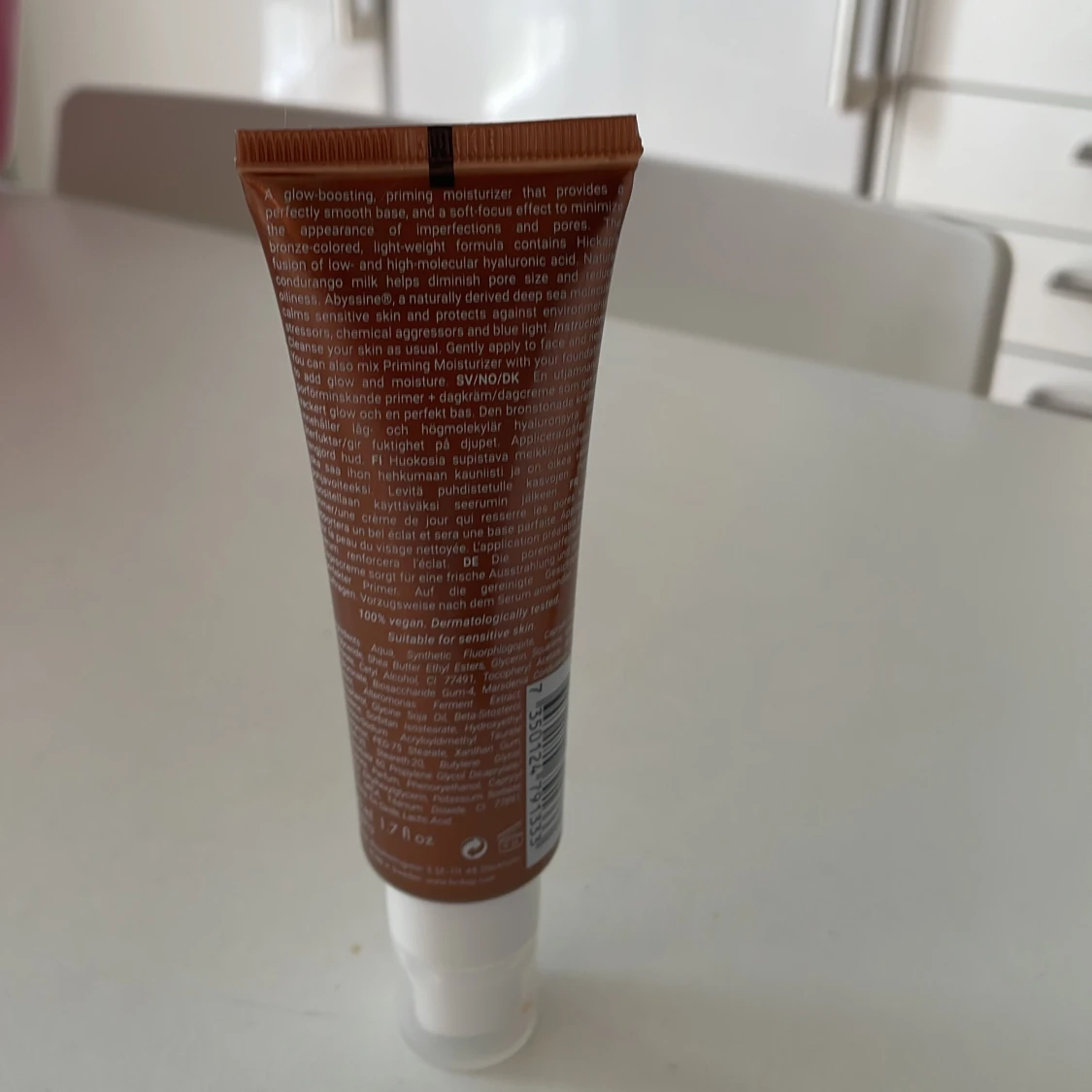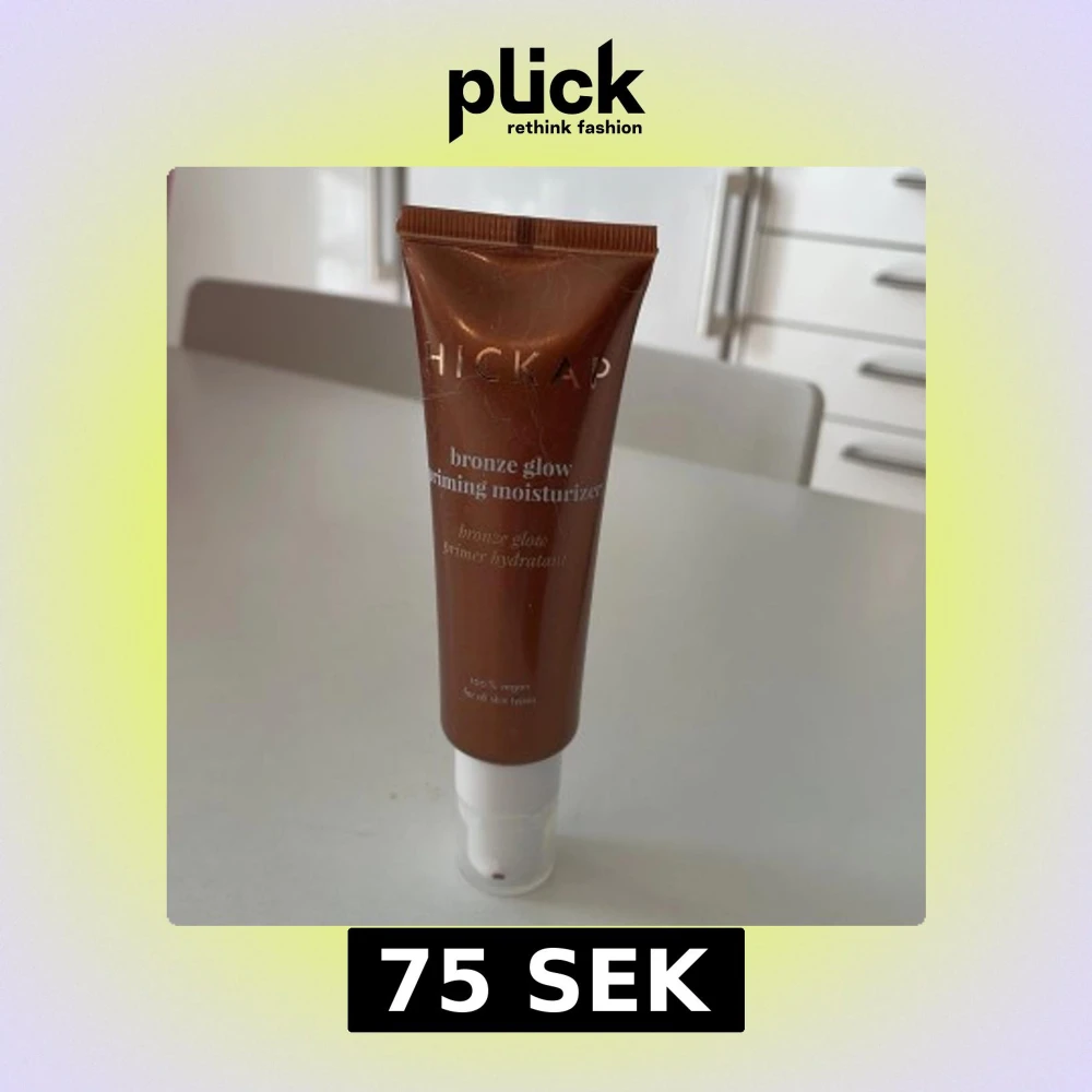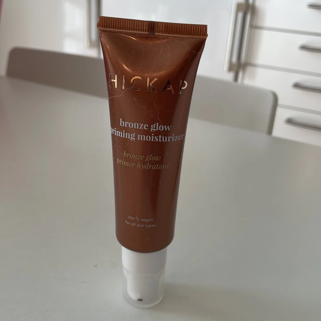 Säljer en Hickap Bronze Glow Priming Moisturizer, en vegansk primer med bronzefärgad formula som ger glow och fukt. Tuben har pump och rymmer 50 ml. Passar alla hudtyper och innehåller hyaluronsyra för extra återfuktning.
