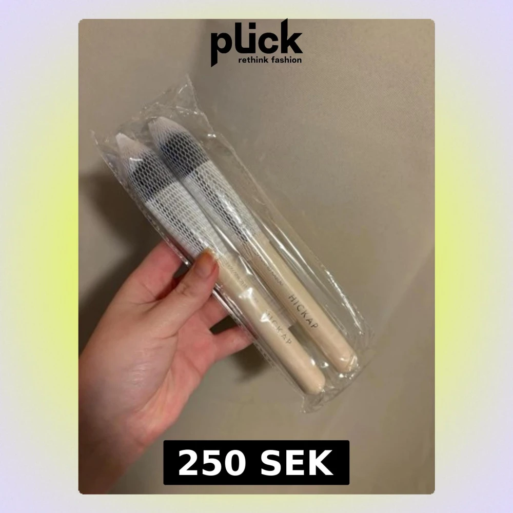 Två sminkborstar från Hickap i limited edition: Round Kabuki 115 och Angled Kabuki 112. Borstarna har vita handtag, silverfärgade detaljer och täta, mjuka borst i svart och vitt. Perfekta för applicering av kräm och flytande sminkprodukter.