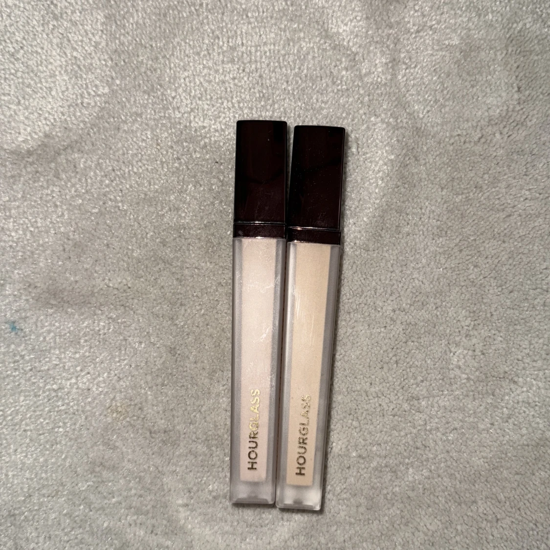 Två flytande concealers från Hourglass i smidiga fyrkantiga tuber med mörkbruna lock. Nyansen är ljusbeige och passar perfekt för att ljusa upp under ögonen eller täcka blemmor. Snygg och stilren design med guldtext på förpackningen i färgerna creme och sepia.