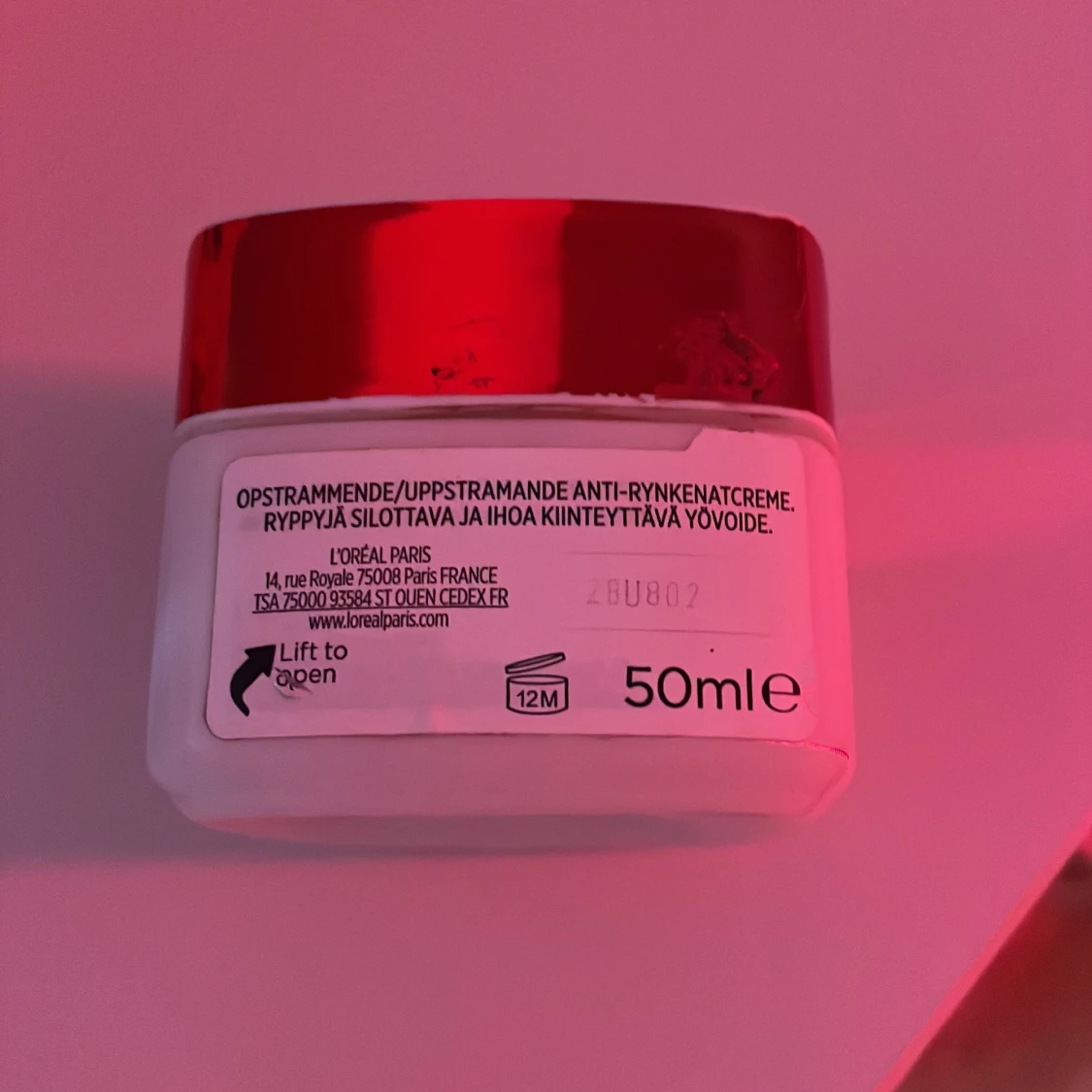 Revitalift Night Cream från L'Oréal Paris är en uppstramande anti-rynk nattkräm. Den kommer i en vit burk med rött lock och innehåller 50 ml kräm. Perfekt för att släta ut rynkor och ge huden fasthet under natten. Jag har som sagt använt den lite men mycket är kvar❤️