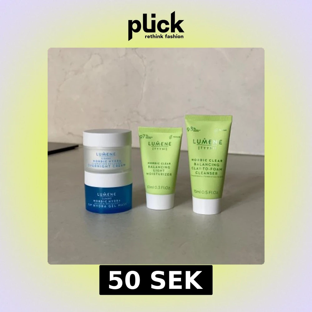 Ett kit med fyra miniprodukter från Lumene: Nordic Hydra Overnight Cream, 72h Hydra Gel Mask, Nordic Clear Balancing Light Moisturizer och Clay-to-Foam Cleanser. Produkterna är oöppnade.