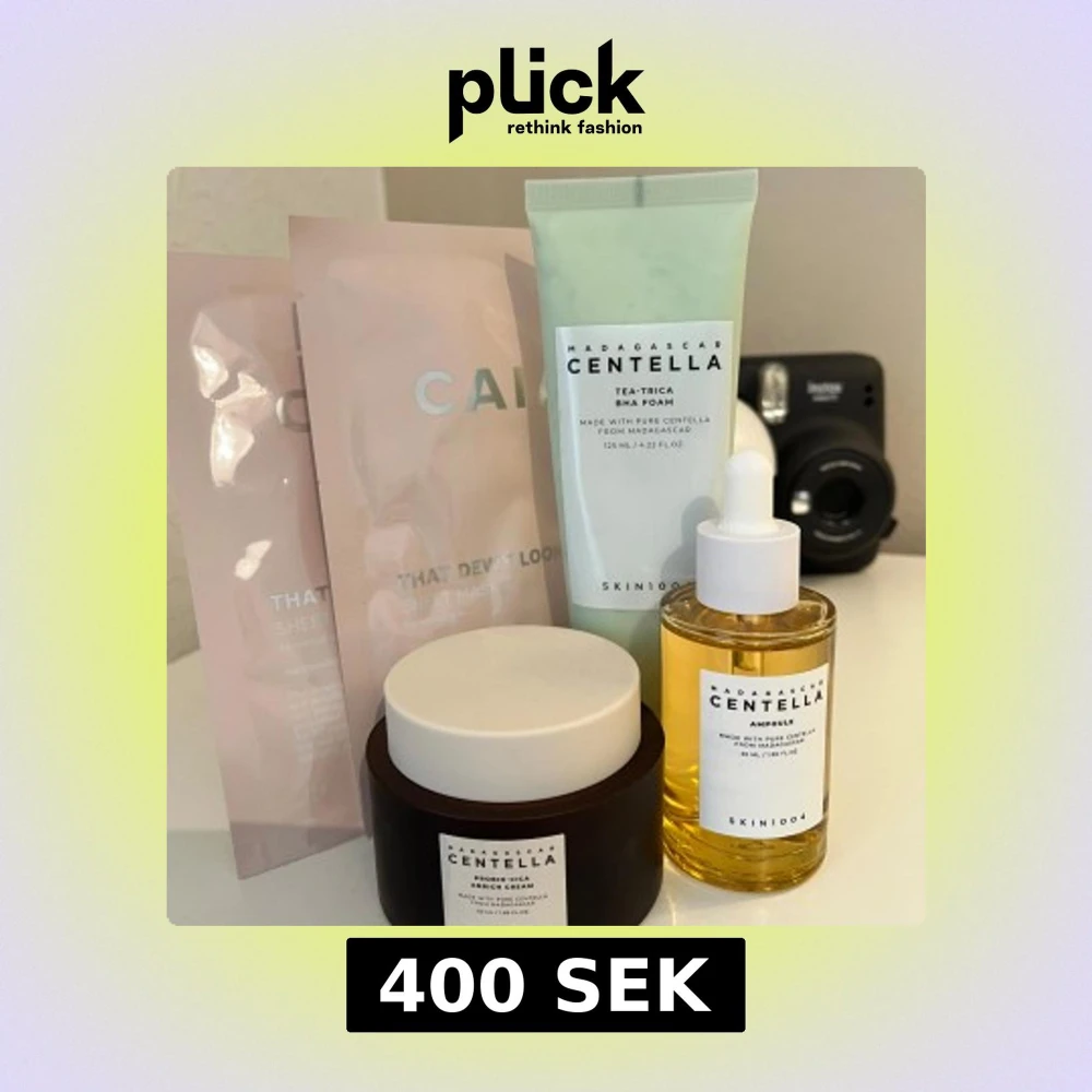 ett set med hudvårdsprodukter från Skin1004. Inkluderar Madagascar Centella Tea-Trica BHA Foam som är en rengöringsskum, Madagascar Centella Ampoule, ett serum och Centella ansiktskräm . Plus 2 sheet mask från CAIA. De funkade tyvärr inte på min hy. Använda 2 gånger. Nypris på allt är ca 900 kr🩷