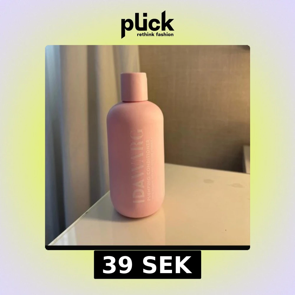 Snygg rosa flaska med plumping conditioner från Ida Warg. Flaskan har en rund form och är tillverkad i plast med vit text. Perfekt för dig som vill ge håret extra volym och vård med en trendig look i badrummet. (‼️Halva kvar)