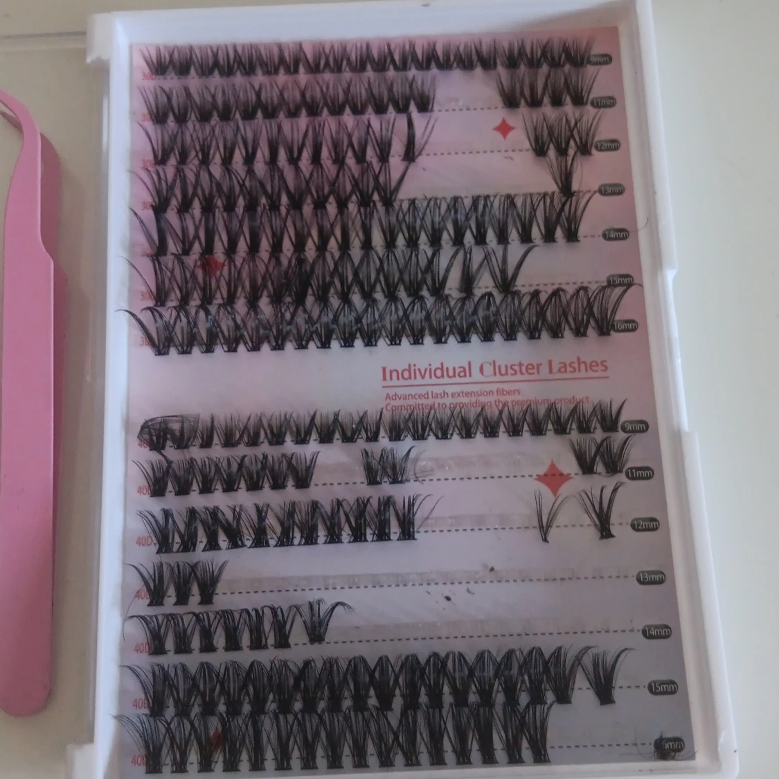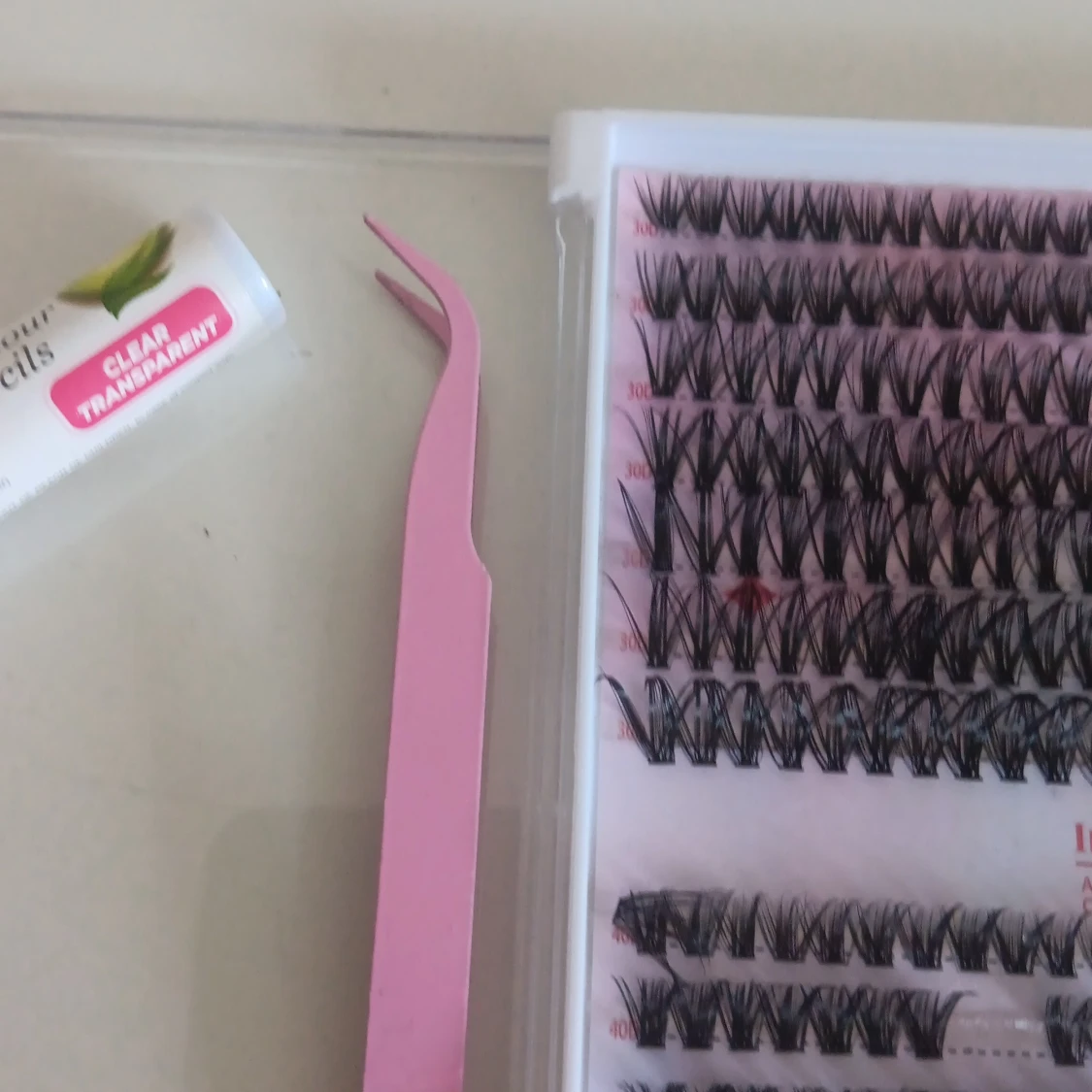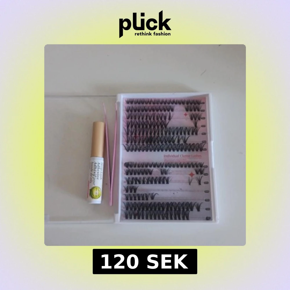 Säljer ett kit med svarta individuella cluster lashes i olika längder (9-16mm), ett genomskinligt franslim med aloe vera och ett rosa appliceringsverktyg. Perfekt för att skapa en personlig franslook med naturlig eller dramatisk effekt.