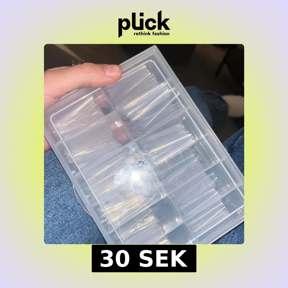Praktisk förvaringslåda med genomskinliga nageltippar i olika storlekar. Perfekt för att skapa egna nageldesigner hemma. Lätt att använda och passar för både professionellt och personligt bruk. (Ca 20 st borta)