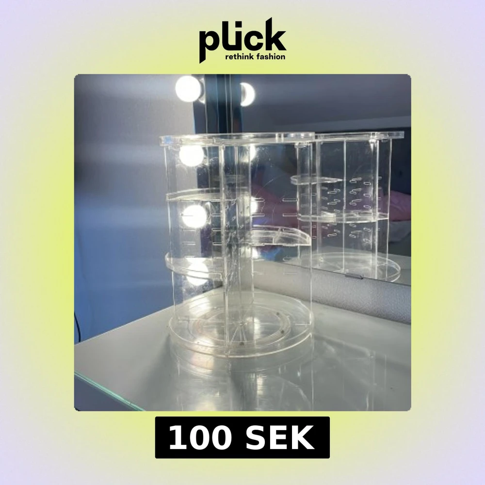 Snygg och praktisk roterande sminkförvaring i transparent akryl. Perfekt för att organisera borstar, läppstift och andra sminkprodukter på sminkbordet. Flera hyllplan och fack gör det enkelt att hålla ordning på dina favoriter.