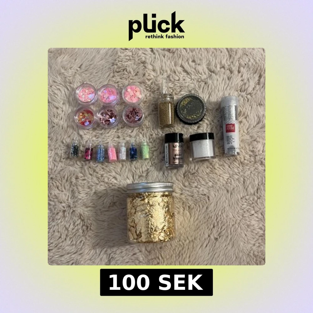 Säljer ett stort kit med glitter och paljetter i olika färger och former, perfekt att ha på naglarna. Innehåller burkar med rosa, guld, silver och blått glitter, paljetter i hjärtan och stjärnor, samt ett stort glas med guld flakes. Märken som NYX och Knorr Prandell ingår.