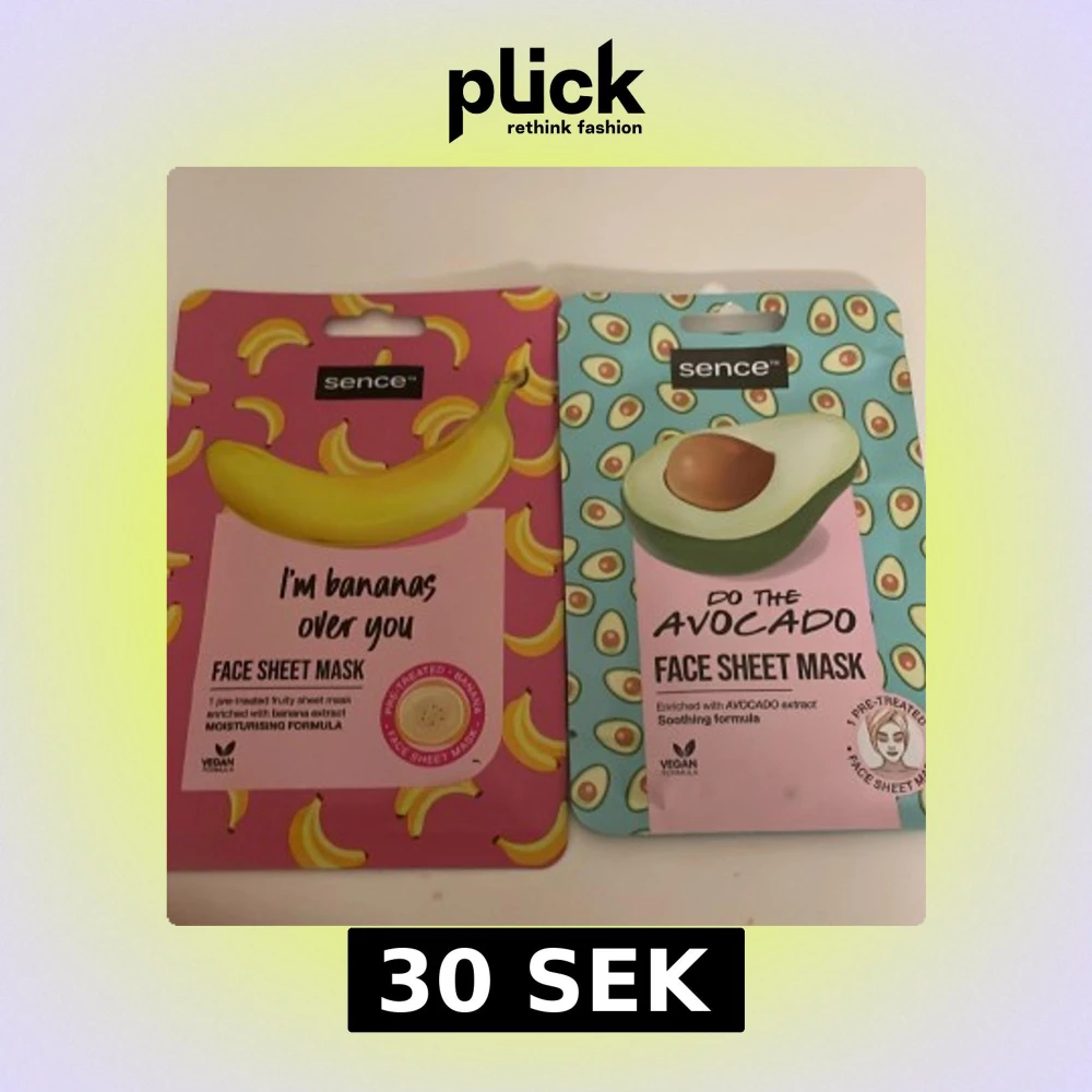 Två ansiktsmasker från Sence: 'I'm bananas over you' med bananextrakt för återfuktning och 'Do the avocado' med avokadoextrakt för lugnande effekt. Båda är veganska och förbehandlade för enkel användning.
