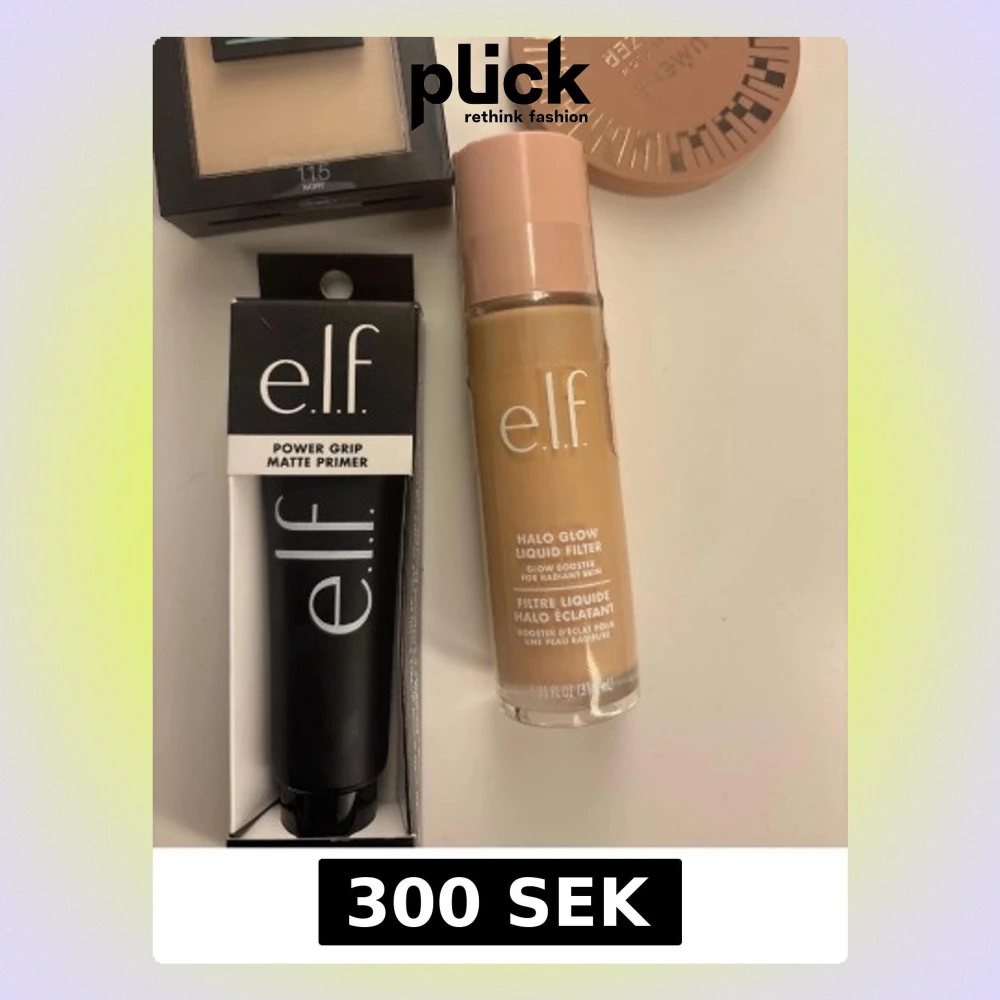 Säljer ett set med e.l.f. Power Grip Matte Primer i svart tub, Halo Glow Liquid Filter foundation med beige ton och ljusrosa lock, samt en rund bronzer i varm brun nyans. Perfekt för att skapa en jämn och glowig bas med snygg contour.