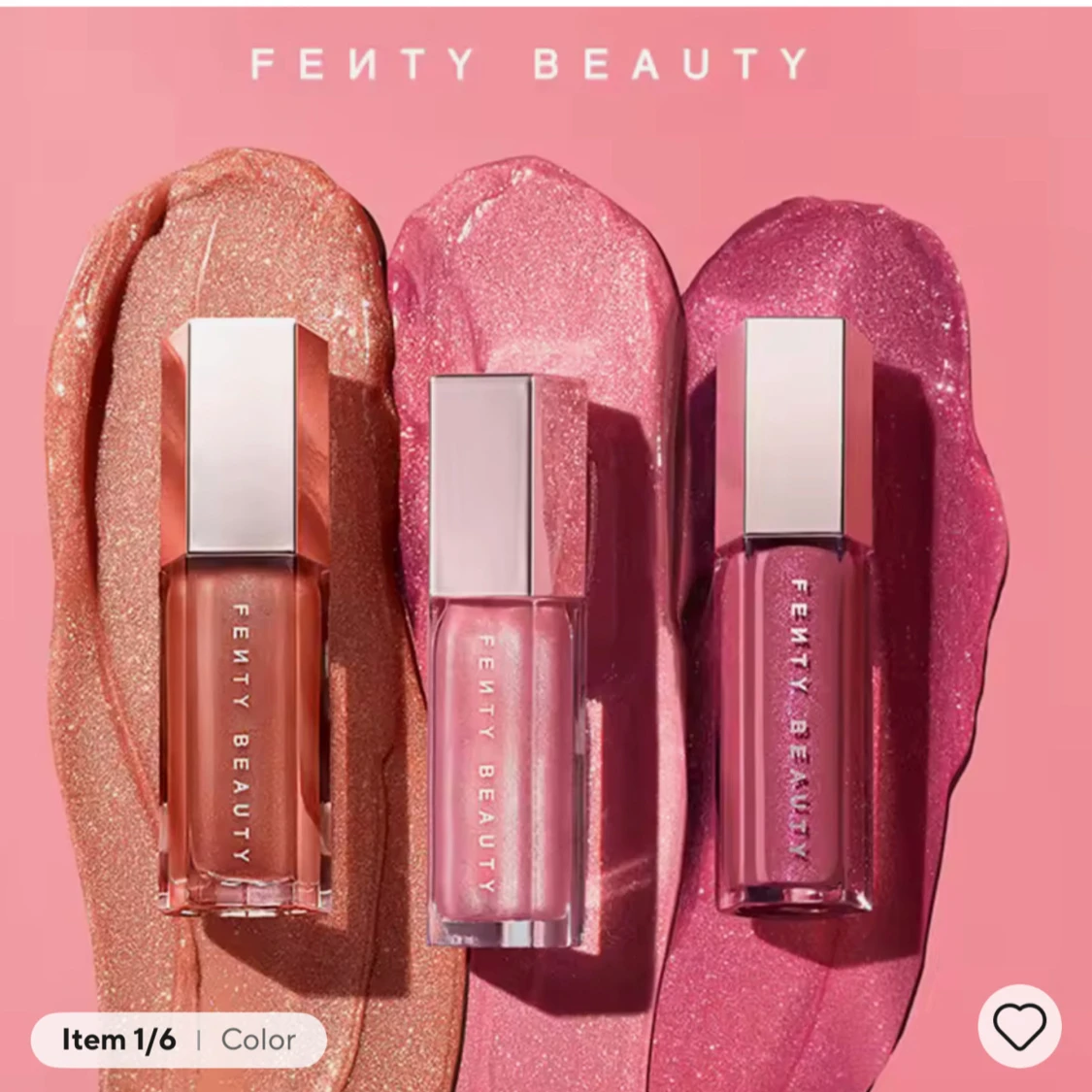 Tre läppglans från Fenty Beauty i snygga nyanser: skimrande persikoton, glittrig ljusrosa och glansig bärrosa. Kommer i stilrena fyrkantiga förpackningar med silvriga lock. Perfekt för att ge läpparna en glansig och fräsch look. Finns i alla färger