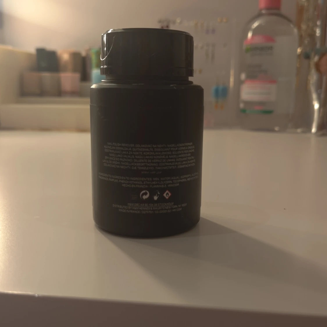 En svart burk med Instant Nail Colour Remover från H&M. Perfekt för att snabbt ta bort nagellack utan bomull, bara stoppa ner fingret i burken. Smidig och enkel att använda, passar bra i väskan.