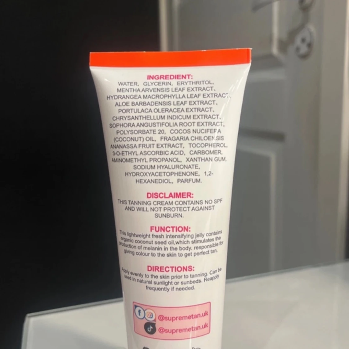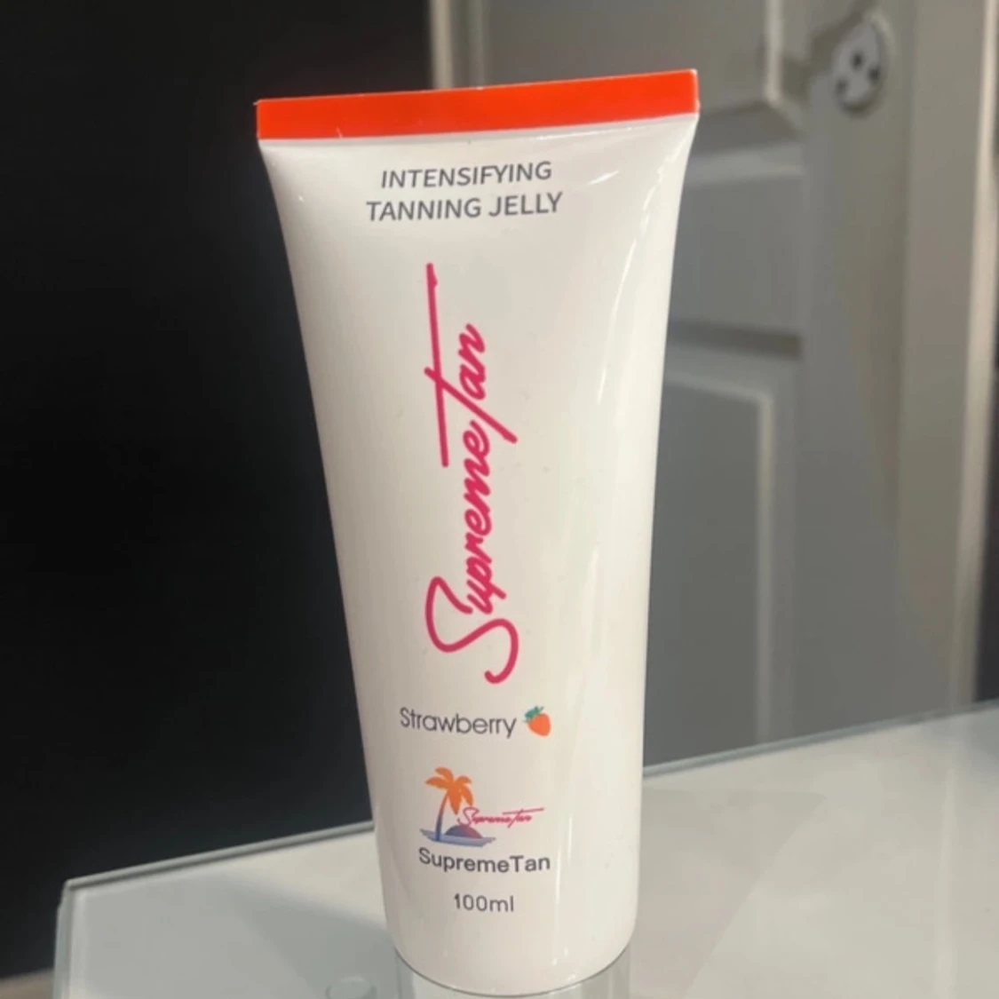 SupremeTan Intensifying Tanning Jelly med jordgubbsdoft. Denna lätta gelé är designad för att intensifiera solbrännan. Innehåller naturliga extrakt som aloe vera och kokosnöt. Perfekt för att få en djupare färg utan SPF-skydd. 100 ml tub med skruvlock. Aldrig öppnad och aldrig använd. Försegling finns på produkten. Köpte för 277 kronor men jag säljer för 200 kronor.✨
