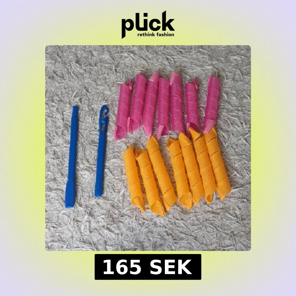 Säljer ett set med rosa och orange hårspolar i spiralform tillsammans med en blå plastkrok (sätts ihop) för enkel användning. Perfekt för att skapa snygga lockar utan värme. Spolarna är gjorda av mjuk plast och är superenkla att använda hemma. 7 orangea och 7 rosa☺️