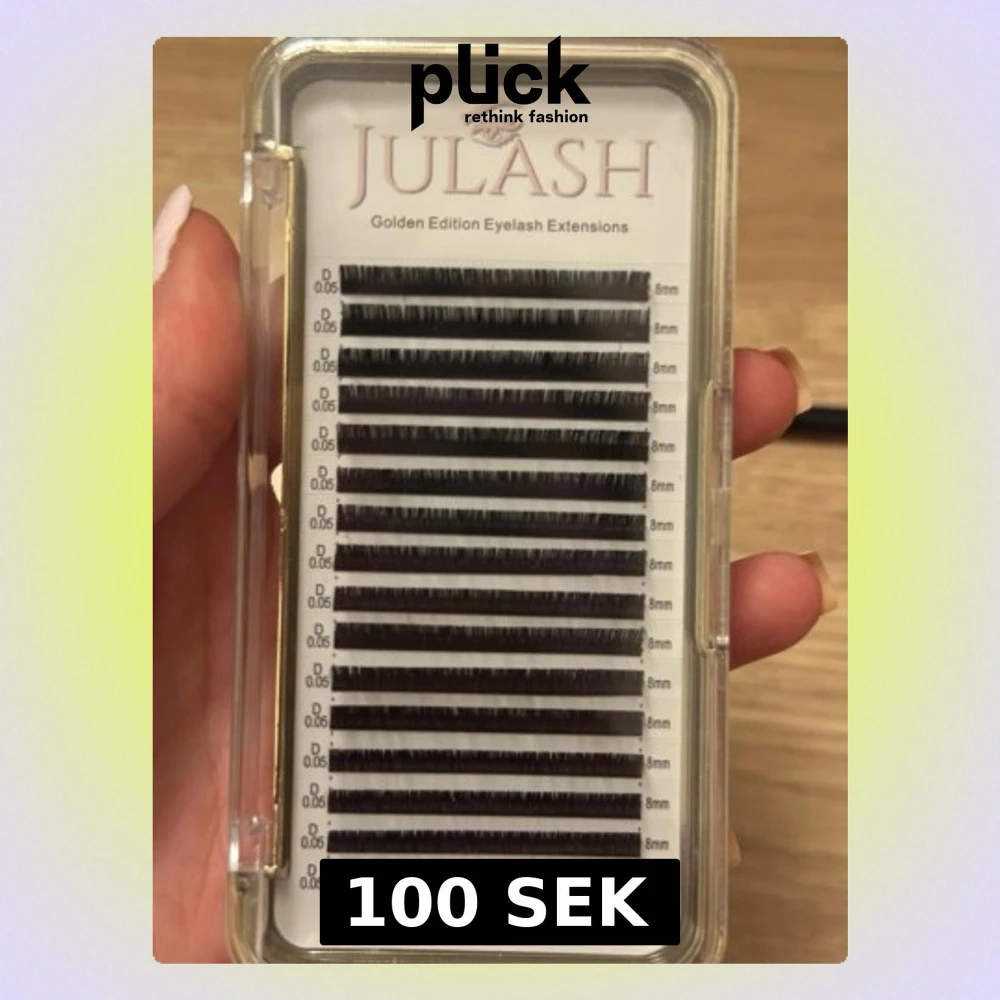 Golden Edition Eyelash Extensions från Julash, 0.05 D-böj och 8mm längd. Svarta fransar i tunn och lätt syntetfiber, perfekt för att skapa en fyllig och naturlig look. Kommer i en praktisk plastask med flera rader för enkel applicering.