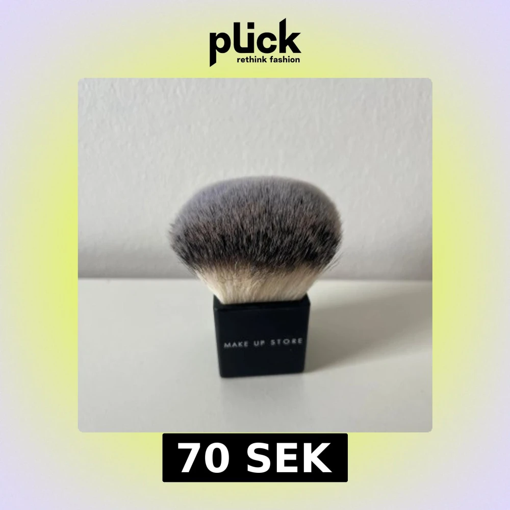 Kabuki-borste från Make Up Store, modell 409. Borsten har täta, mjuka syntetstrån i grått och vitt och ett stilrent svart fyrkantigt handtag. Perfekt för att applicera puder, bronzer eller rouge med jämnt och snyggt resultat.