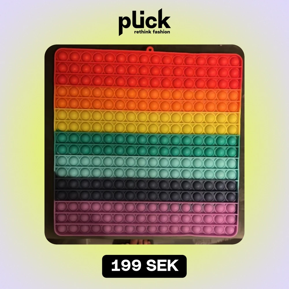 En stor fyrkantig pop it i regnbågens färger. Den har rader av bubblor som kan tryckas in och poppas ut, vilket ger en tillfredsställande känsla och ljud. Perfekt för stressavlastning eller bara för att ha kul! 🌈❤️🧡💛💚💙💜🩷