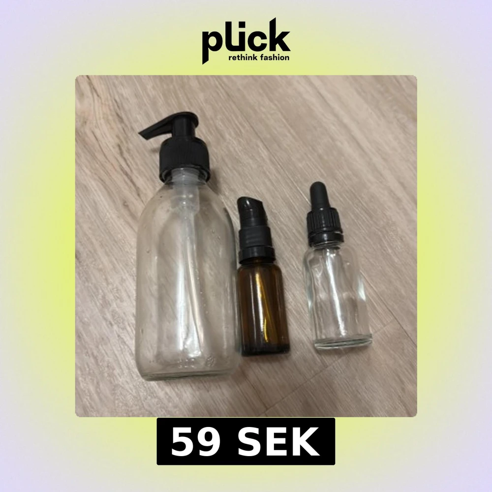 Säljer tre tomma glasflaskor i olika storlekar. En stor genomskinlig flaska med svart pump, en mindre brun flaska med svart spraypump och en liten genomskinlig flaska med svart pipett. Perfekta för DIY-projekt eller förvaring av egna krämer och oljor! Kommer urtvättade!