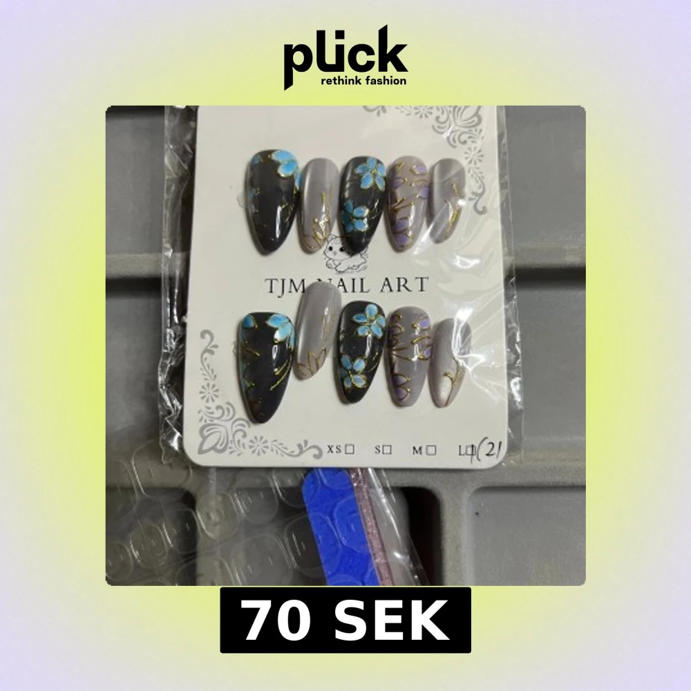 Snygga lösnaglar i mandelform. Dekorerade med handmålade blå blommor och guldiga detaljer. Perfekt för dig som vill ha en unik och färgstark nagelstil. Kommer i storlek L.