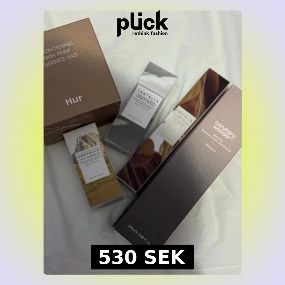 Säljer ett hudvårdspaket med Hur Brightening Skin Prep Essence Pad, Haruharu Wonder Black Rice Facial Oil och flera produkter från SKIN1004 Centella. Perfekt för dig som vill boosta din hudvårdsrutin med essence pads, olja och centella-extrakt.