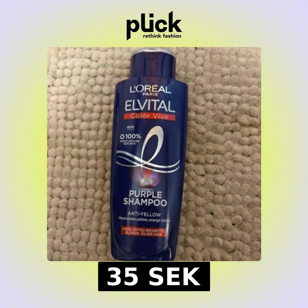Lila schampo från L'Oréal Elvital Color Vive, 200 ml, speciellt för att neutralisera gula och orange toner i blont, slingat eller silverfärgat hår. Kommer i en mörklila plastflaska med röd och vit text. Perfekt för dig som vill fräscha upp hårfärgen.