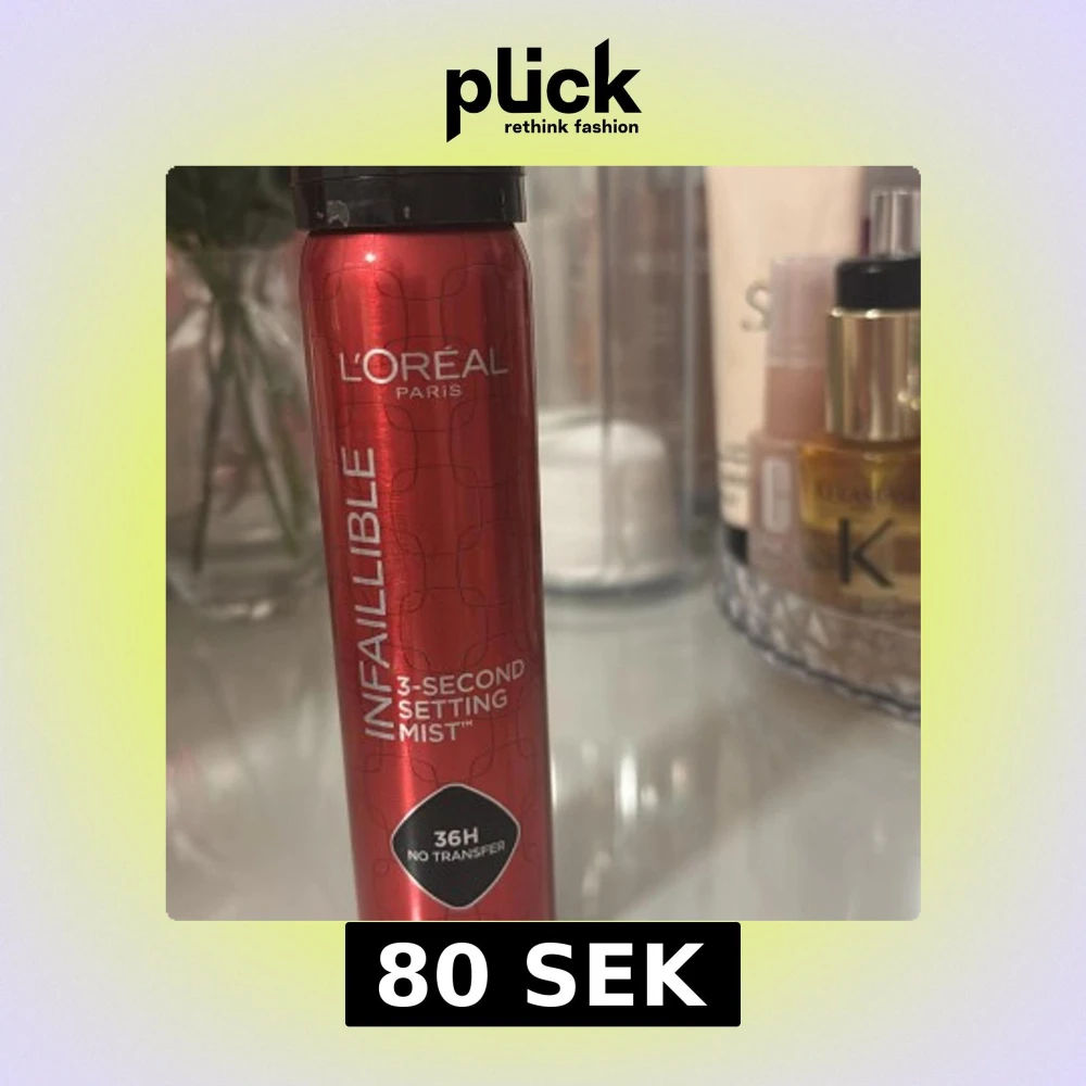L'Oréal Infaillible 3-Second Setting Mist i röd metallisk flaska. Ger makeupen en hållbar finish i upp till 36 timmar utan att sminka av sig på kläder. Perfekt för att fixera din look snabbt och enkelt.