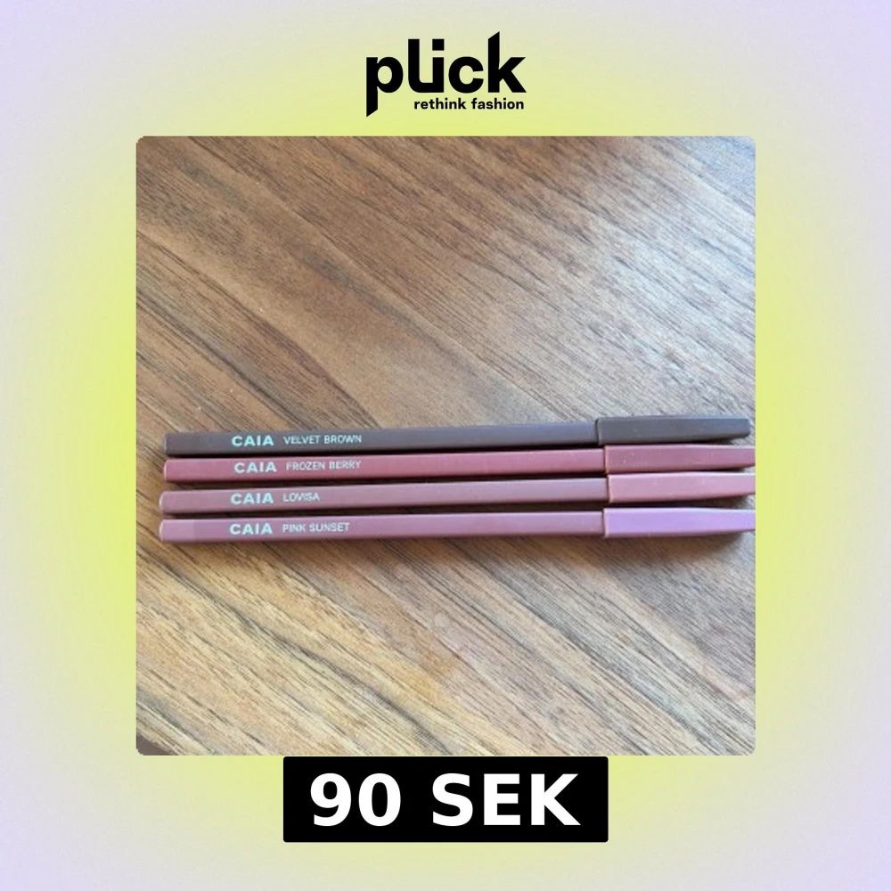 Fyra läppennor från CAIA i olika nyanser: Velvet Brown, Frozen Berry, Lovisa och Pink Sunset. Kan sälja alla 4 ihop eller separat. Ej testade på läpp. Ej vässade. Se varje bild. 90kr styck eller alla för 300