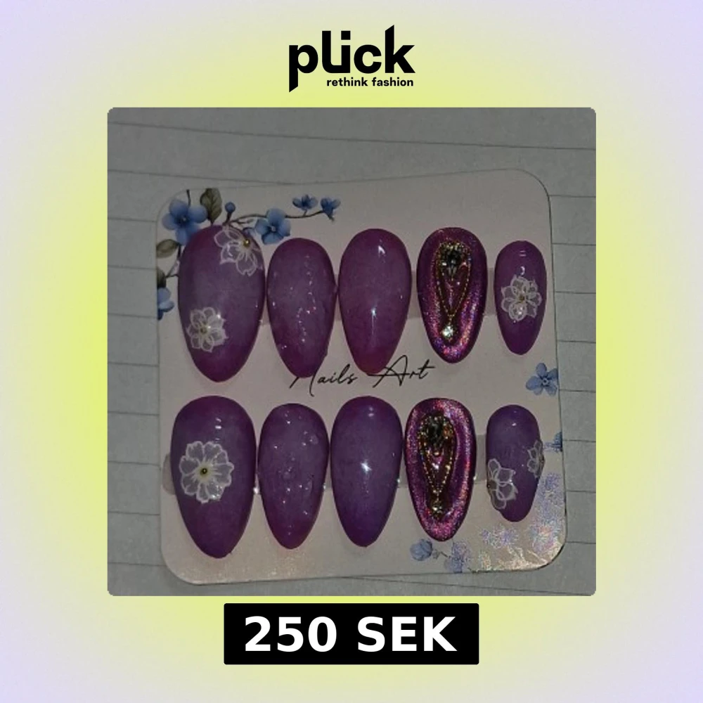Säljer ett set med lila konstgjorda naglar i mandelform. Naglarna har glansig finish, vita blommor med små pärlor och två naglar med glittrande dekorationer i guld och silver. Perfekt för dig som vill ha en unik och kreativ look.