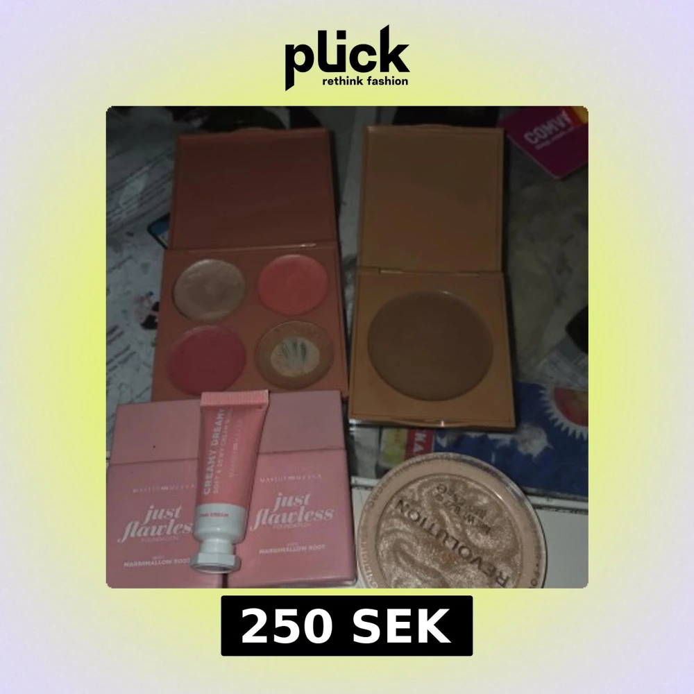 Pris kan diskuteras. Säljer ett sminkkit med Makeup Mekka Just Flawless foundation (Just Happy, Just Right), Creamy Dream blush Pink Dream, palett med rouge och highlighter, samt Warm Breeze cream bronzer. Revolution highlighter i guldig nyans ingår också. Vissa saker är helt nya