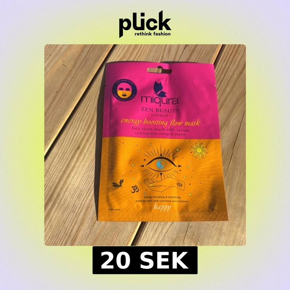 Säljer en ansiktsmask från Miqura Zen Beauty, energy-boosting flow mask med serum. Masken är berikad med apelsin och papaya, och kommer i en färgstark förpackning med rosa och orange design. Perfekt för dig som vill ge huden extra fukt och näring.