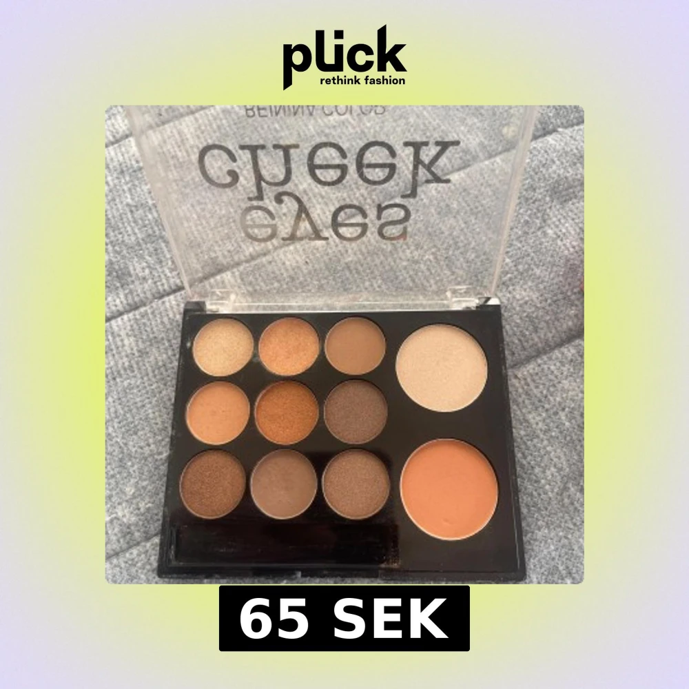 Snygg ögonskuggspalett från Benina Color med 12 olika nyanser. Paletten innehåller både matta och skimrande färger i jordnära toner, perfekt för både vardag och fest. Den har en genomskinlig plastförpackning med texten 'eyes cheek' på locket. Är lite använt som det syns på bild och priset går att diskutera