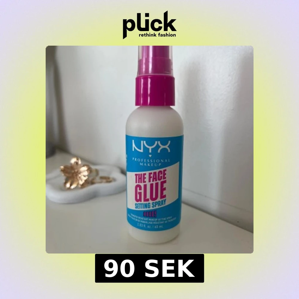 NYX Professional Makeup The Face Glue Setting Spray i en vit plastflaska med blå och rosa etikett. Sprayen har ett rosa lock och rymmer 60 ml. Perfekt för att fixera sminket hela dagen. Helt ny och oanvänd