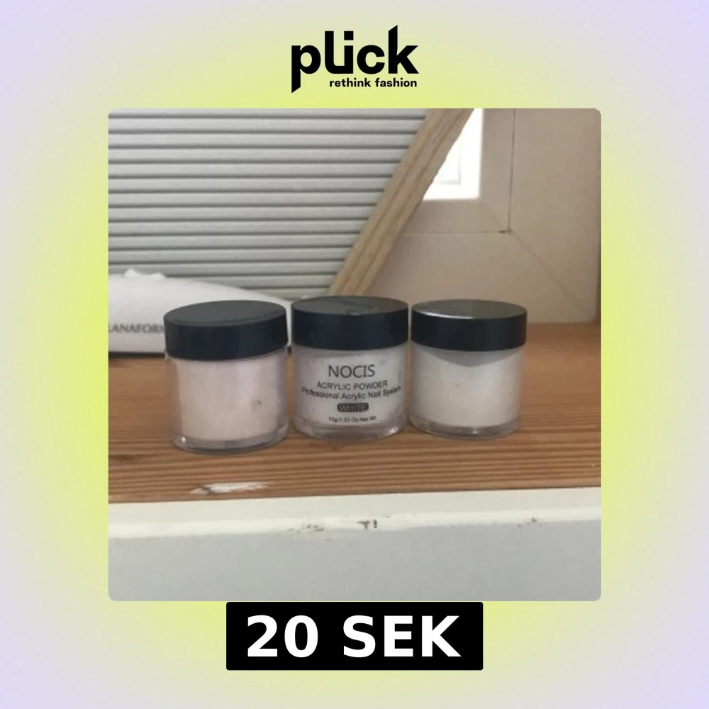 Tre burkar NOCIS akrylpulver för professionellt akrylnagelsystem. En burk är märkt 'WHITE', de andra är i ljusa, neutrala nyanser. Perfekt för att bygga och forma snygga naglar hemma. Kommer i genomskinliga plastburkar med svart lock. En är lite använd resten är igen använda