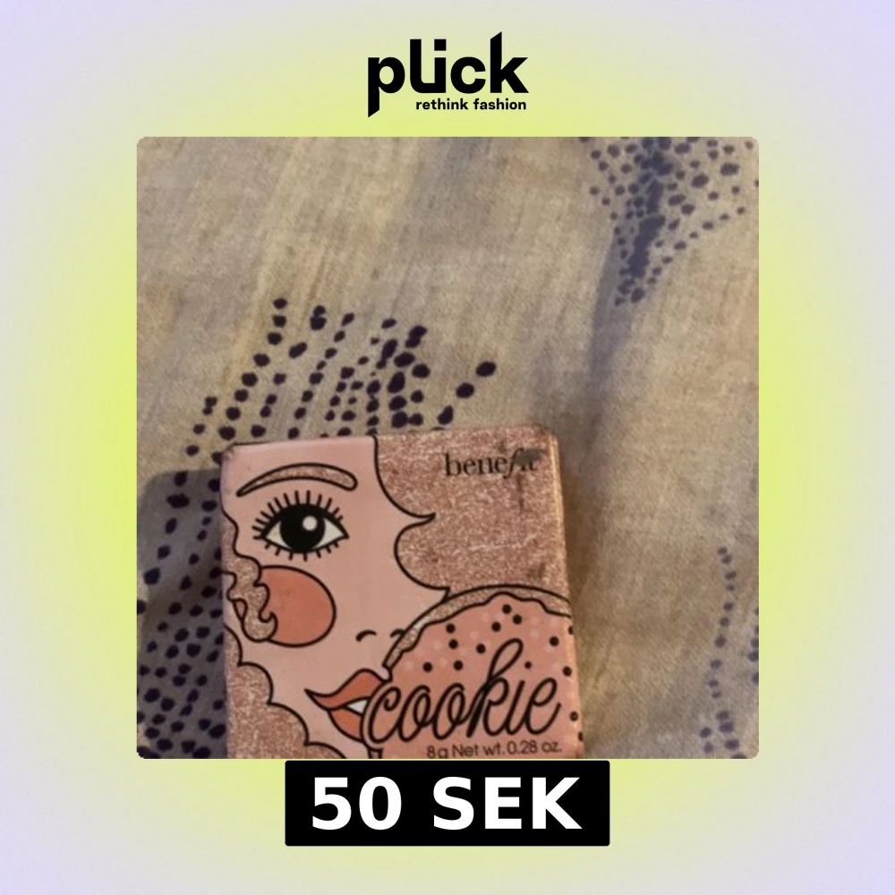Säljer en highlighter från Benefit i nyansen 'Cookie'. Den ger en mjuk guldskimrande finish och kommer i en söt förpackning med popkonst-design. Perfekt för att framhäva kindbenen med en gyllene lyster. Den är dock använd, tappade den och mycket av produkten ramlade men den funkar forfarande som den ska!