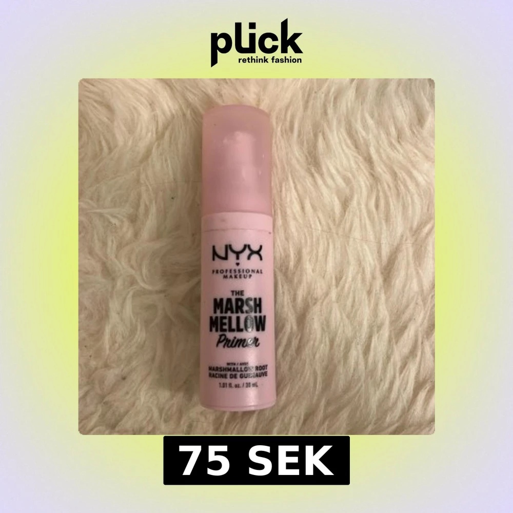 NYX The Marshmellow Primer i en ljusrosa flaska. Denna primer innehåller marshmallowrot och ger en jämn bas för smink. Perfekt för att förbereda huden innan foundation.